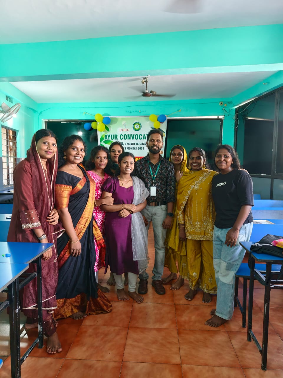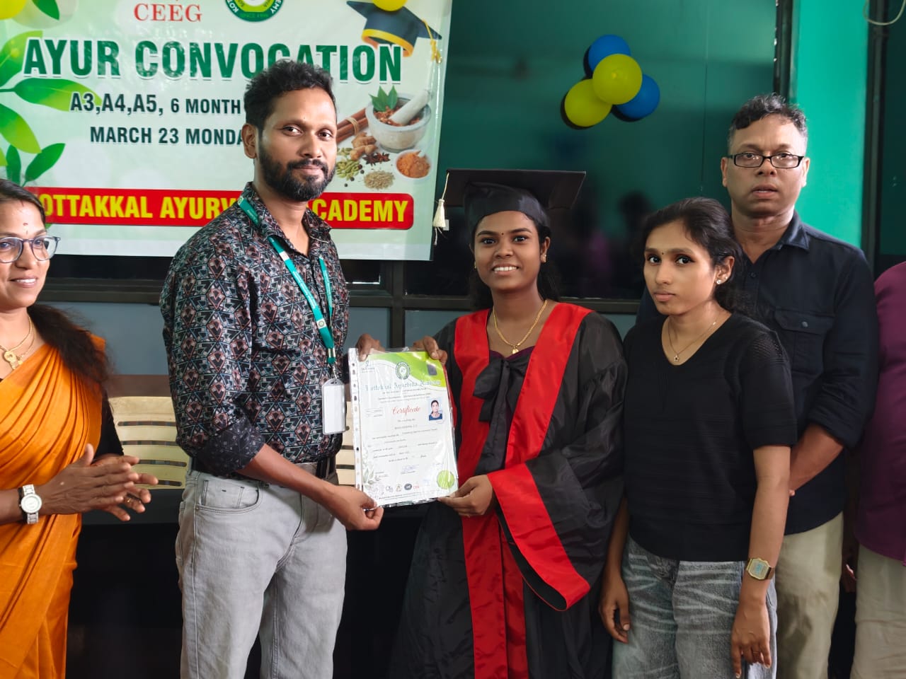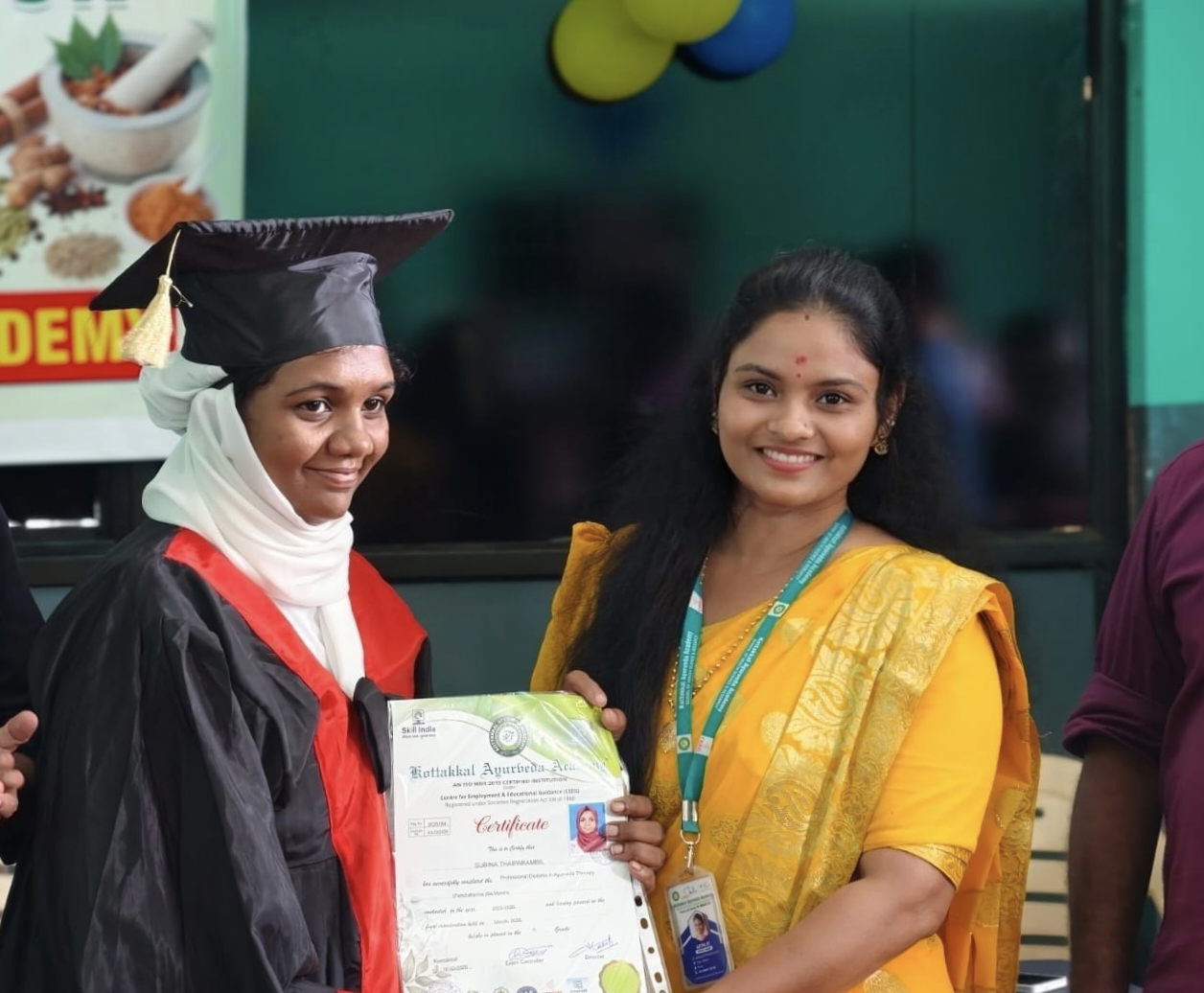 Job offer letter distribution ceremony for the completers of the free Ayurvedic Panchakarma Therapy course conducted at Kottakkall Ayurveda Academy in collaboration with NABARD, along with the NABARD Manager.
